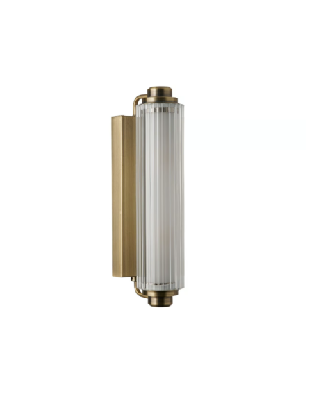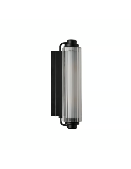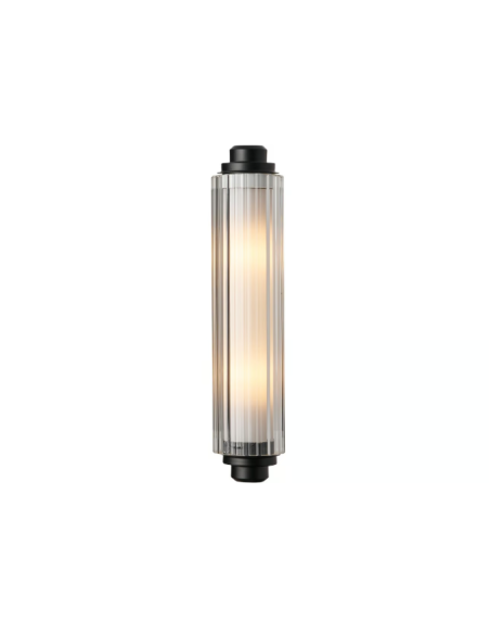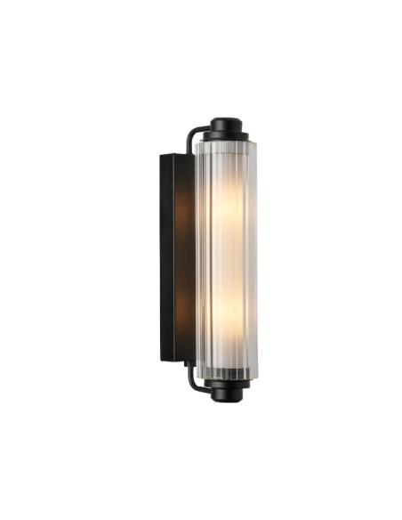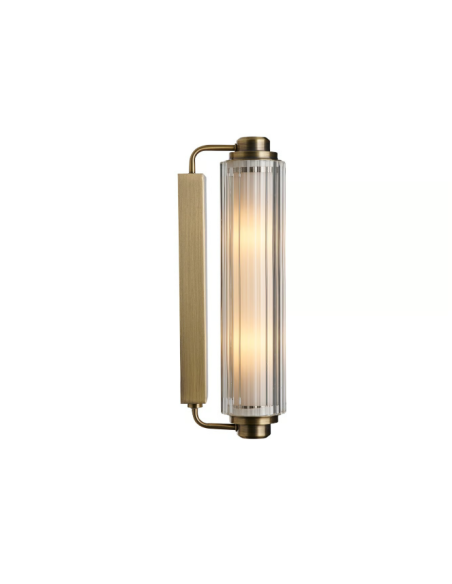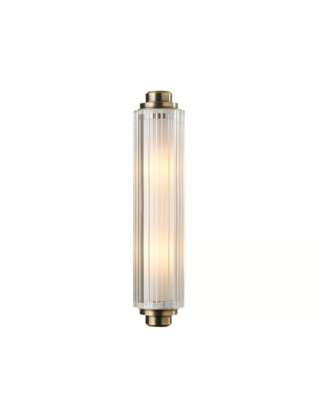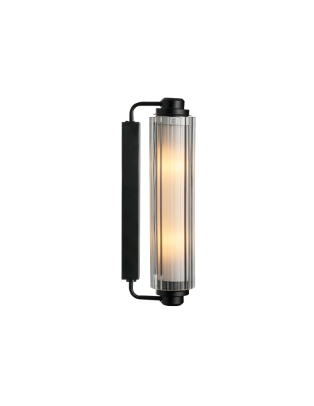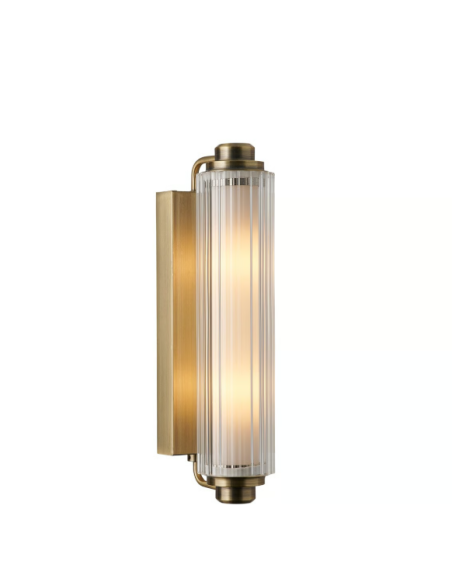 A luminária de parede dupla Nimal possui um design arredondado e sofisticado da linha Art Déco, com uma bela cúpula canelada. O difusor branco opala garante uma iluminação agradável. É adequada para banheiros por ter proteção IP44, sendo ideal para instalação acima ou ao lado do espelho.