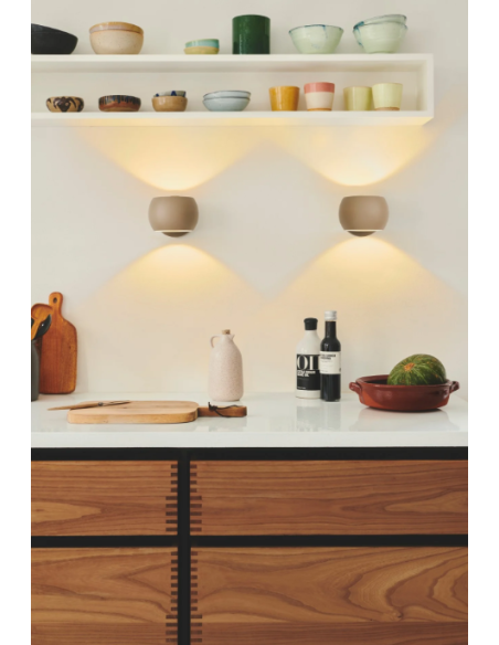 Com um formato pequeno e arredondado, o aplique Belir adapta-se perfeitamente a vários espaços, como acima do balcão da cozinha, ao lado da cama ou junto ao sofá. Emite uma luz suave para cima e para baixo, proporcionando um efeito luminoso decorativo e acolhedor na parede. A sua cúpula giratória (360°) permite ajustar facilmente a direção da luz, oferecendo flexibilidade na criação de diferentes atmosferas. Para um impacto visual mais criativo, é possível combinar várias luminárias Belir e orientá-las em diferentes direções, acrescentando dinamismo e originalidade ao ambiente.