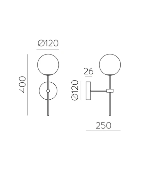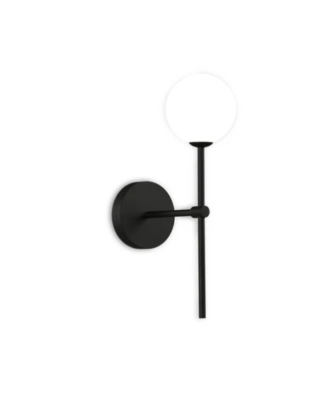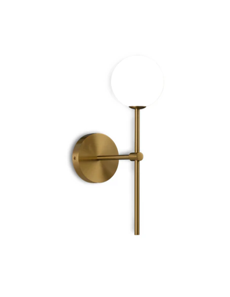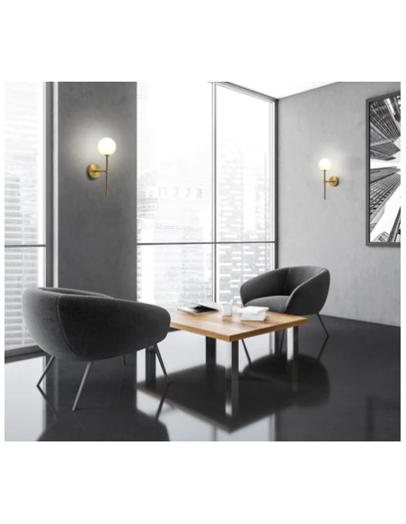 A Doris IP44 Ø12 é uma arandela de parede da marca ACB com design moderno e minimalista. Possui estrutura metálica em acabamento preto texturizado ou ouro antigo, combinada com um globo difusor em vidro opalino que suaviza a luz. Tem 40 cm de altura, base de parede com 12 cm de diâmetro e 25 cm de profundidade. Utiliza uma lâmpada G9 (até 7 W, não incluída) e possui proteção IP44, sendo indicada para ambientes húmidos, como casas de banho. Classe de isolamento II e instalação fácil em parede.
