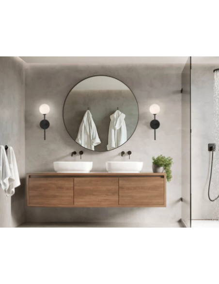A Doris IP44 Ø12 é uma arandela de parede elegante e compacta, com globo opalino e acabamento moderno, ideal para casas de banho graças à proteção IP44 e compatível com lâmpadas G9 de até 7 W.
