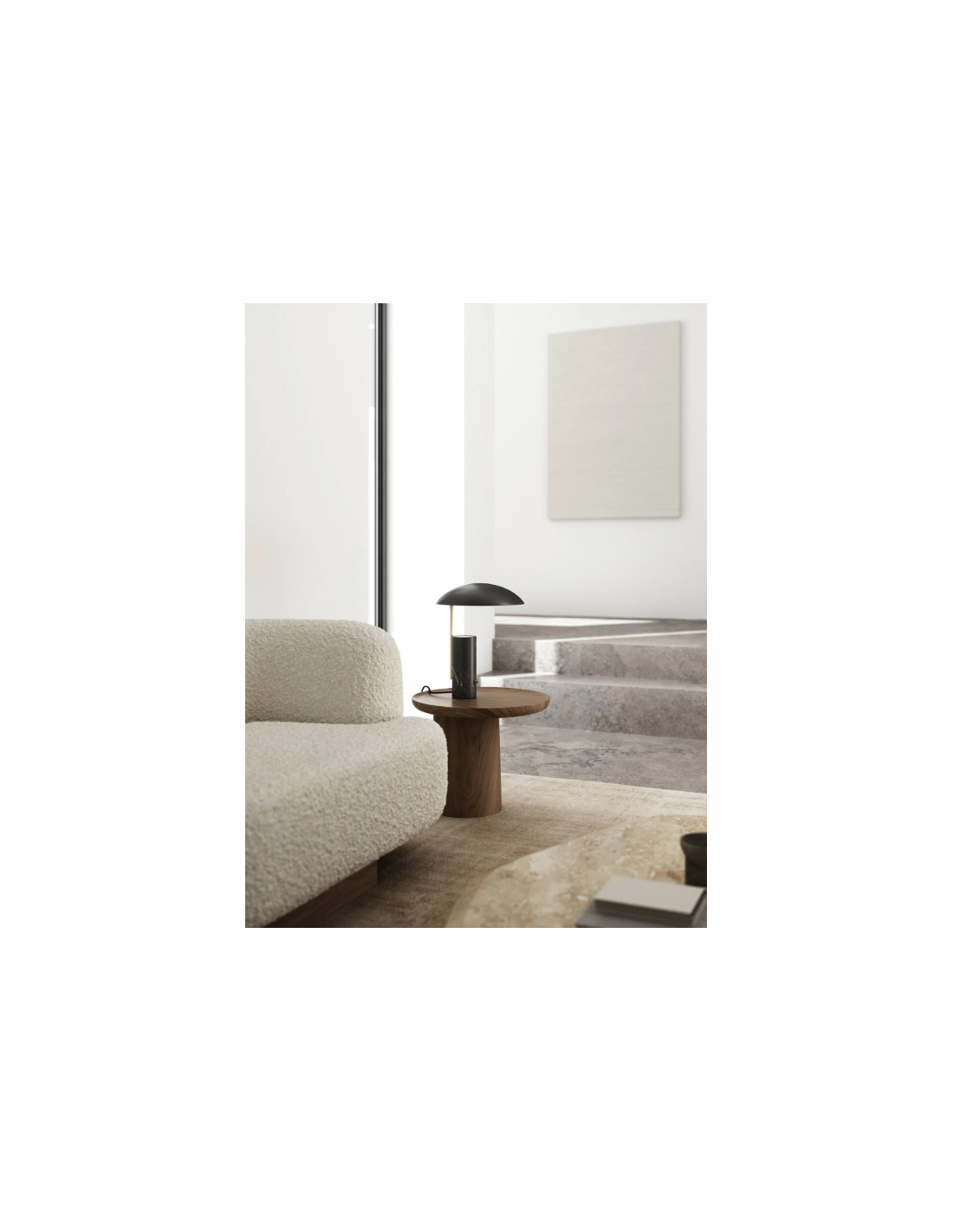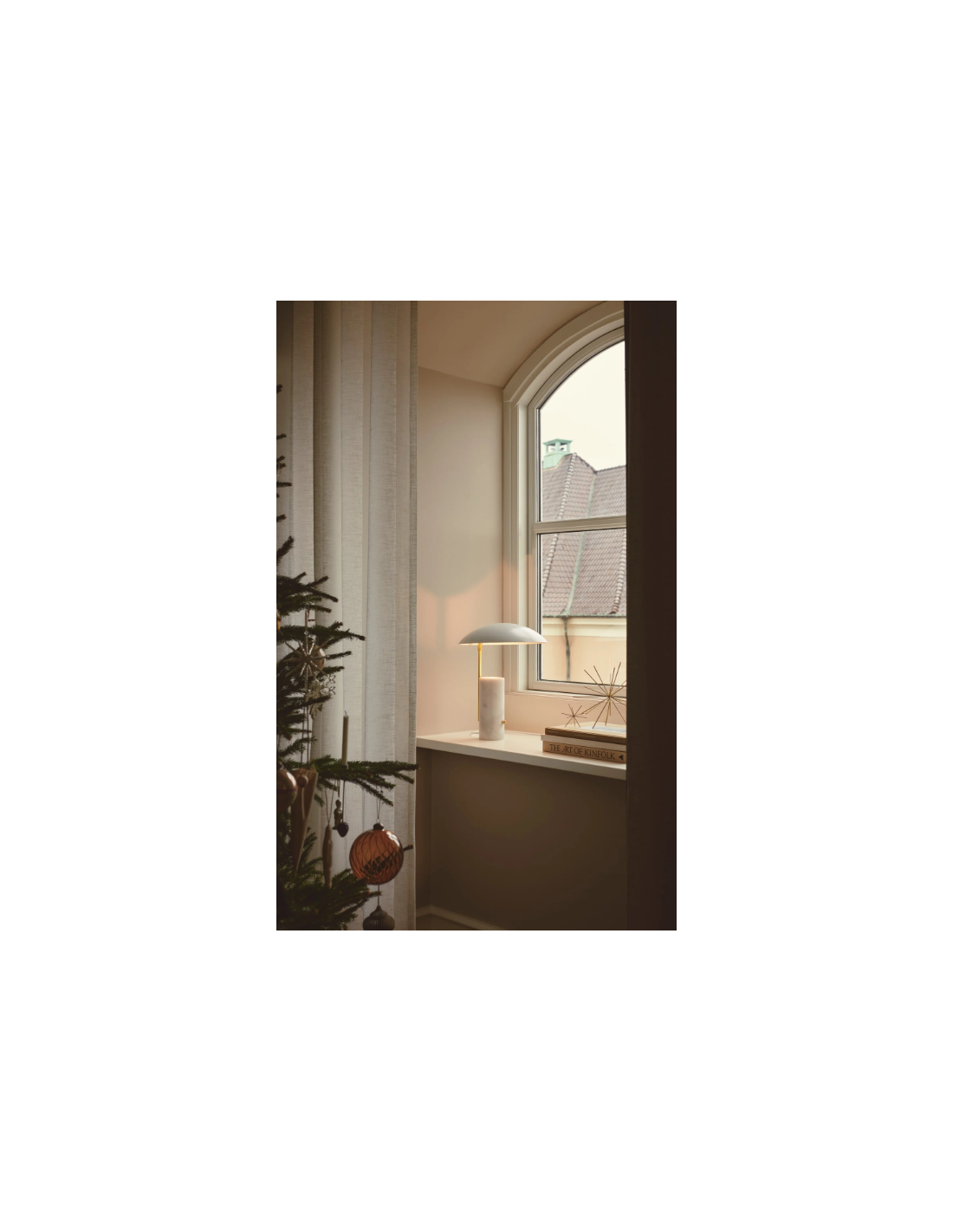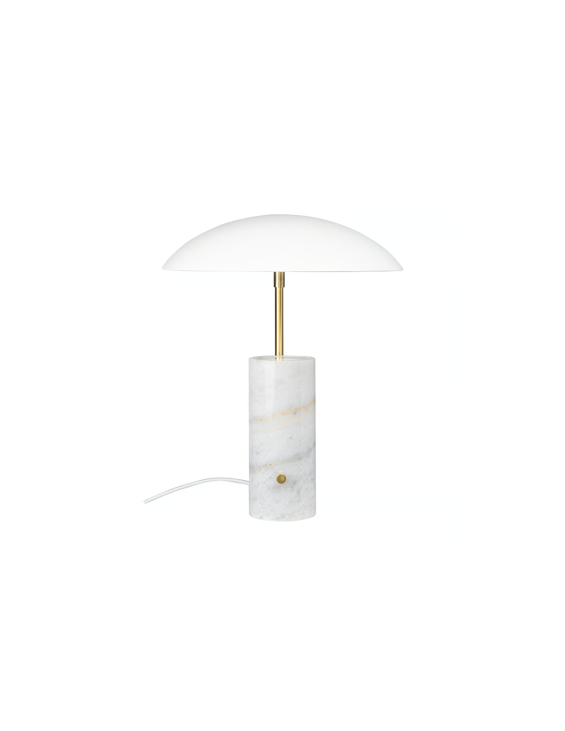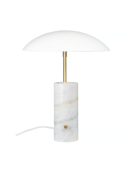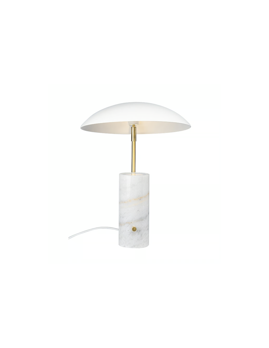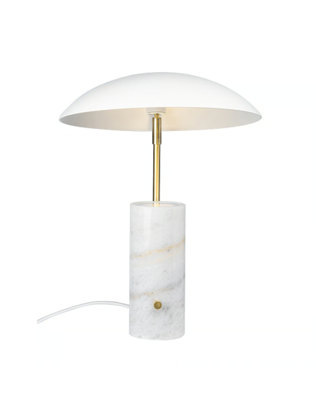 A grande cúpula redonda e ajustável permite redirecionar a luz para cima, oferecendo uma iluminação suave e indireta, perfeita para criar atmosferas acolhedoras e intimistas. A base em mármore natural, sólida e sofisticada, contrasta com os detalhes em latão e metal, reforçando a exclusividade e o cuidado nos acabamentos.