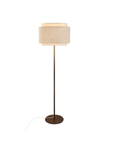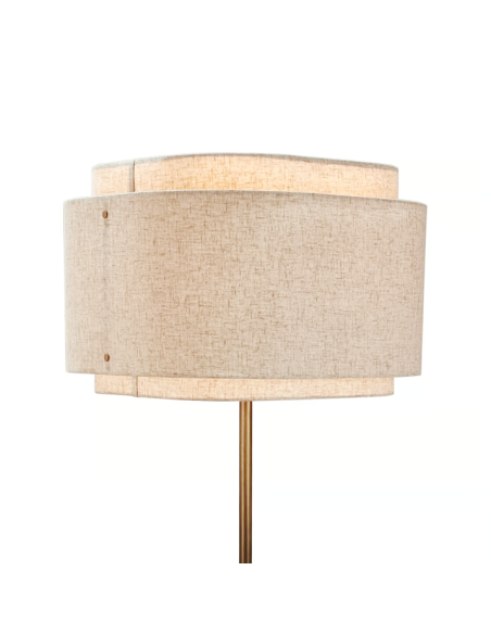 A base em latão brunido contrasta subtilmente com a leveza do tecido, criando uma linguagem visual suave e requintada. A luz emitida é envolvente e confortável, ideal para criar ambientes relaxantes e intimistas.
