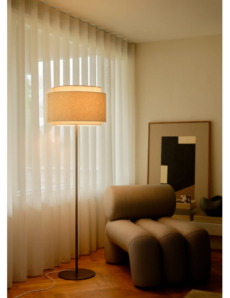 O Candeeiro de Pé Takai, assinado pelo Studio Mavro//Lefèvre, da designer Sofie Lefèvre, combina elegância contemporânea com uma atmosfera acolhedora e luxuosa. A peça destaca-se pelo seu abajur de tecido em linho, com uma forma cuidadosamente desenhada para ser apreciada de todos os ângulos, evocando a sensação sofisticada de um hotel de alto padrão.
