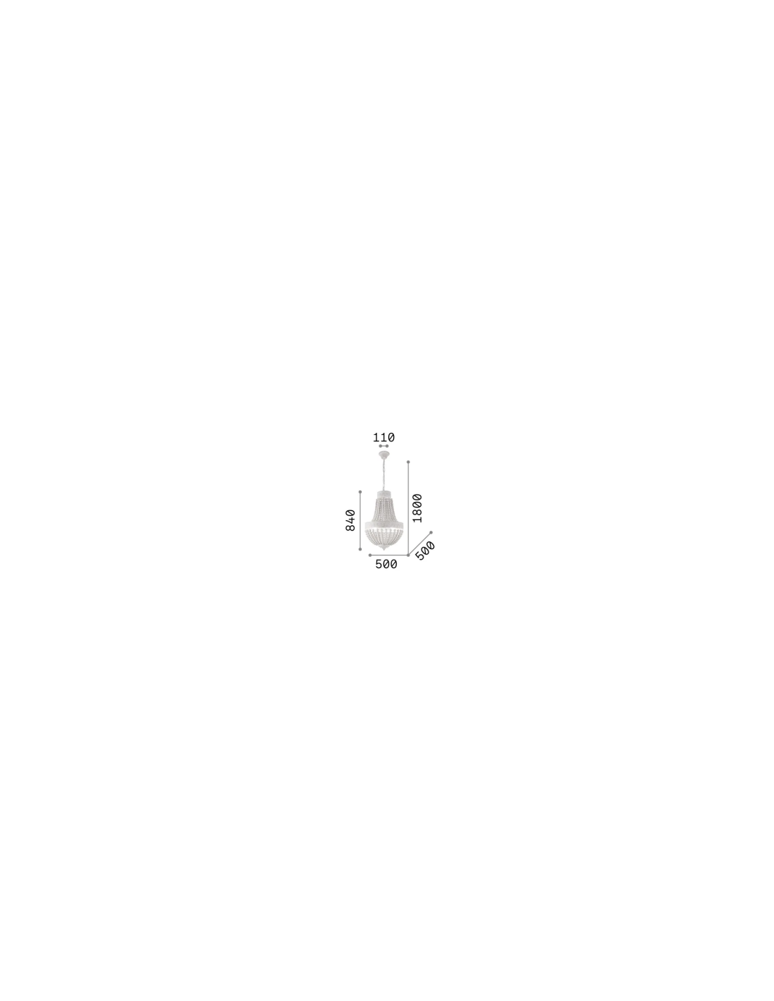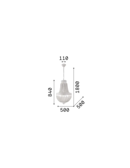 Estrutura metálica com faixas circulares decoradas em relevo. Correntes com contas de madeira natural. Acabamento com verniz branco mate.