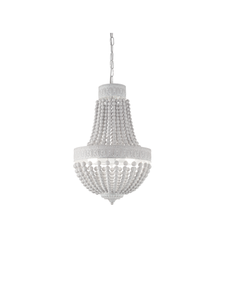 Estrutura metálica com faixas circulares decoradas em relevo. Correntes com contas de madeira natural. Acabamento com verniz branco mate.