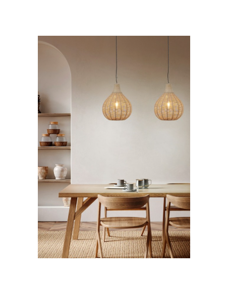 A Janne é uma luminária suspensa de 54 cm de diâmetro, altura ajustável até ~183 cm, soquete E27 (LED até 10 W, não incluído), que projeta um bonito jogo de luz e sombra em ambientes internos modernos