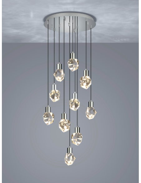 Trio LightingO VERANO é um candeeiro suspenso LED com 10 lâmpadas, combinando cristal fino e metal para um design sofisticado e atmosfera elegante em qualquer divisão.