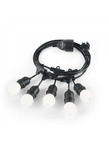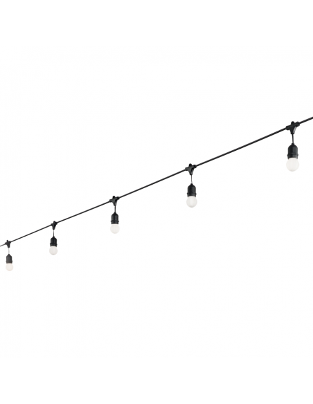Cabo elétrico de plástico preto, soquete de lâmpada e ilhós. Fornecido com ficha para exterior.