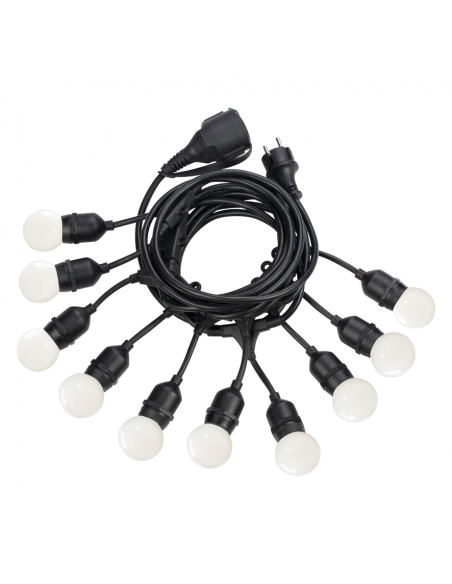 Cabo elétrico de plástico preto, soquete de lâmpada e ilhós. Fornecido com ficha para exterior.