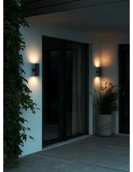 Fabricado em aluminio, projeta luz em ambas as direções (para cima e para baixo), criando um efeito de iluminação sofisticado na parede. Ideal para espaços exteriores modernos.