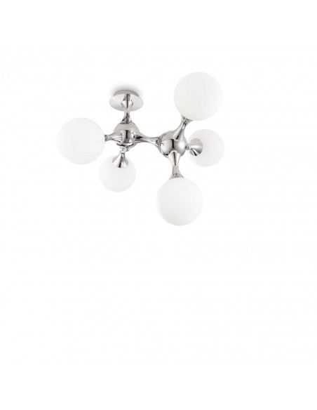 Estrutura metálica em latão cromado ou acetinado. Difusores em vidro soprado ou transparente ou cromado gravados com ácido branco.