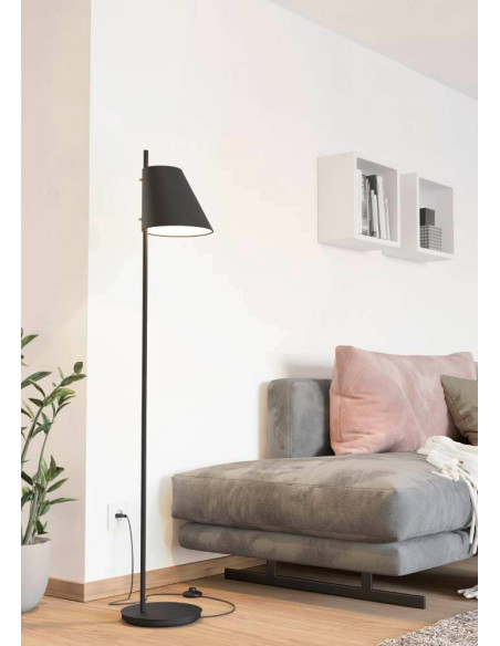 O candeeiro de pé ESTAZIONA é feito de metal preto e tem um abajur posicionado na lateral da estrutura com acabamento em tecido preto. Com o seu design monocromático, este candeeiro de pé integra-se em interiores modernos e minimalistas. O produto também pode ser ligado e desligado facilmente utilizando o interruptor de chão em linha.