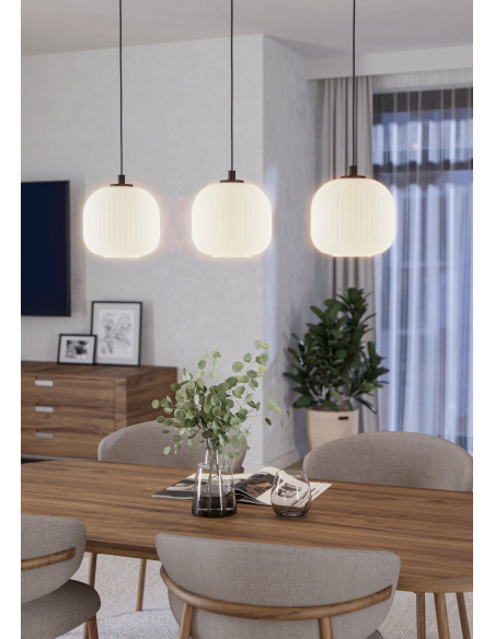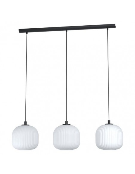 O candeeiro suspenso MANTUNALLE apresenta três abajures redondos feitos de vidro branco com nervuras e um suporte de metal preto. Combina na perfeição com interiores modernos e escandinavos, proporcionando uma iluminação elegante para qualquer espaço, seja na cozinha, na sala de estar ou sobre a mesa da sala de jantar.