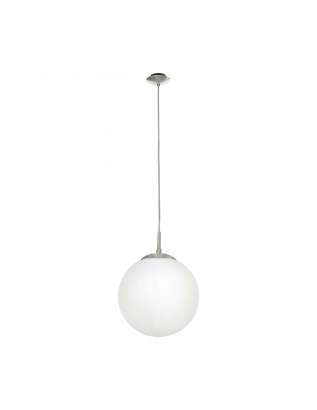 O candeeiro suspenso RONDO apresenta uma esfera de vidro opalino branco mate suspensa numa cobertura redonda em metal níquel acetinado. Com o seu design simples, combina na perfeição com vários estilos de design de interiores e proporcionará uma iluminação acolhedora para a sua casa, seja na sala de estar ou na sala de jantar.
