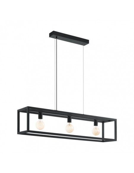 O candeeiro de teto suspenso ELSWICK apresenta três suportes de lâmpadas expostos em metal preto, rodeados por uma estrutura retangular em metal preto. Proporciona uma iluminação distinta na sala de estar ou sobre uma mesa comprida na sala de jantar e integra-se perfeitamente com decoração de interiores moderna.