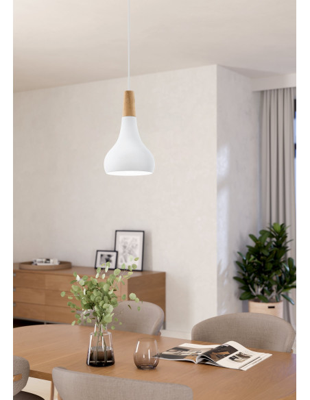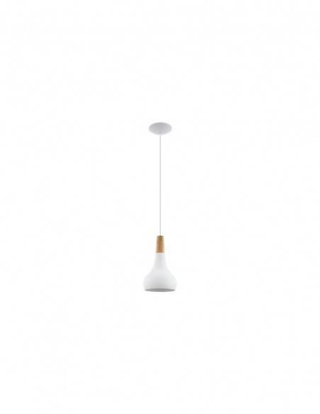 O candeeiro de teto suspenso SABINAR apresenta um abajur curvo em metal com acabamento em branco, suspenso num cabo branco. O abajur tem um elemento de madeira castanha que complementa o encanto do candeeiro. Com o seu design escandinavo e diâmetro de 18 cm, proporcionará uma iluminação elegante na sua sala de estar ou de jantar. Requer 1 lâmpada E27, que não está incluída.