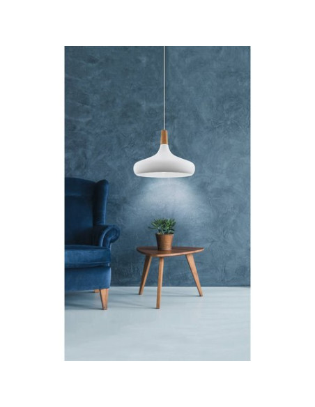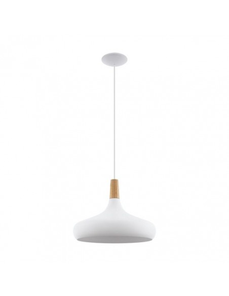 O candeeiro de teto suspenso SABINAR apresenta um abajur curvo em metal com acabamento em branco, suspenso num cabo branco. O abajur tem um elemento de madeira castanha que complementa o encanto do candeeiro. Com o seu design escandinavo e diâmetro de 18 cm, proporcionará uma iluminação elegante na sua sala de estar ou de jantar. Requer 1 lâmpada E27, que não está incluída.