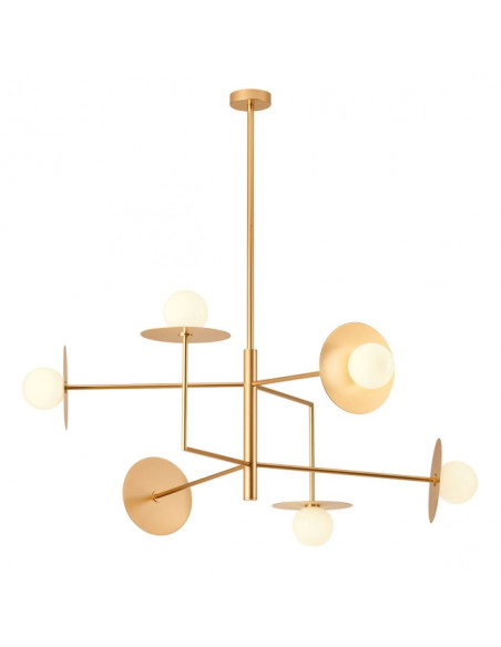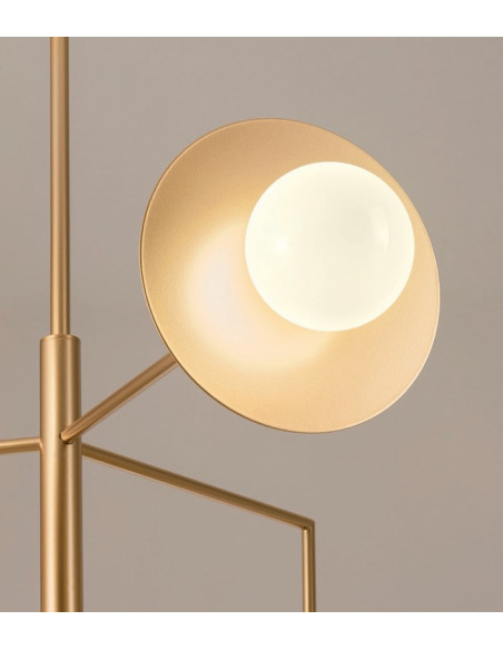 Suspensão para interior, estrutura metálica pintada em ouro mate, difusores em vidro opala soprado. Materiais: metal