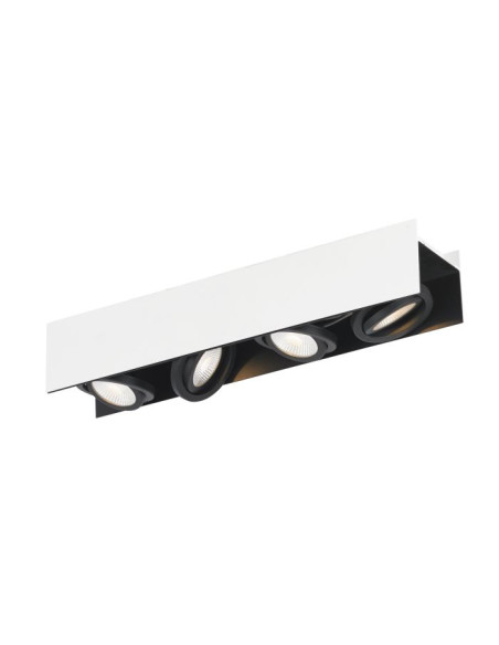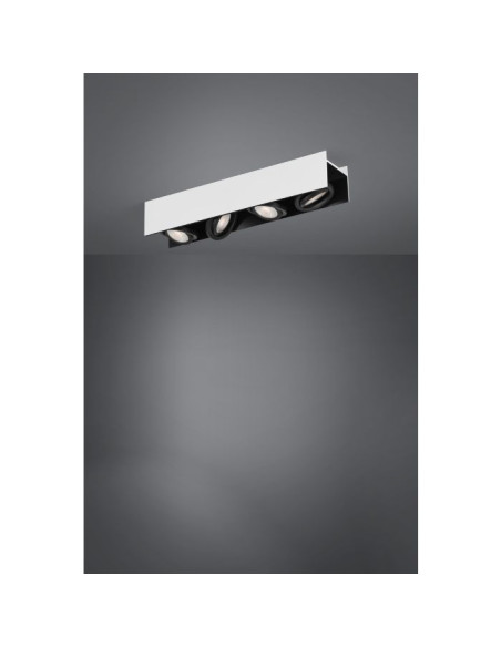 O candeeiro de teto LED VIDAGO é composto por um corpo retangular em metal branco com quatro projetores reguláveis embutidos de cor preta. Os lados mais curtos do corpo estão abertos e revelam a superfície interior preta do candeeiro. Os LED integrados produzem uma agradável luz branca quente e podem ser regulados através de um regulador rotativo que pode instalar na parede (consulte lista de compatibilidades). Integra-se perfeitamente em interiores minimalistas e permite-lhe acentuar áreas individuais da divisão, seja na cozinha, na sala de estar ou no corredor.