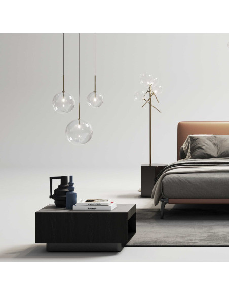 Com estrutura metálica em ouro escovado e difusores em vidro opalino, este candeeiro evoca a harmonia entre formas esféricas e linhas verticais, criando um efeito visual elegante tanto de dia como quando iluminado.