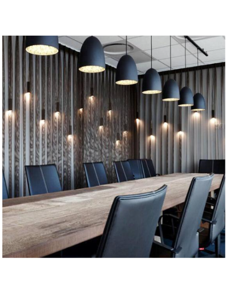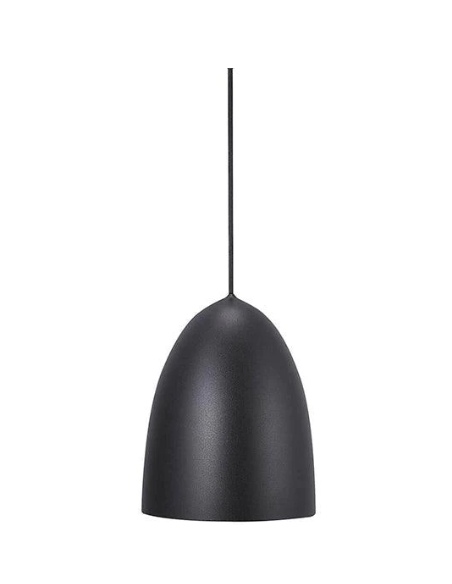 Com estrutura em metal preto mate e difusor em forma de sino, esta suspensão oferece uma luz focada e confortável, perfeita para mesas pequenas, ilhas de cozinha estreitas, bancadas, mesas de cabeceira ou como elemento decorativo em zonas de passagem.