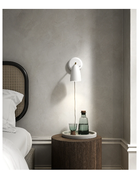 Com estrutura em metal preto mate, difusor fixo em forma de sino e interruptor integrado na base, é ideal como luz de leitura em cabeceiras de cama, iluminação de apoio em corredores, ou luz decorativa em espaços de hotelaria e habitação moderna.