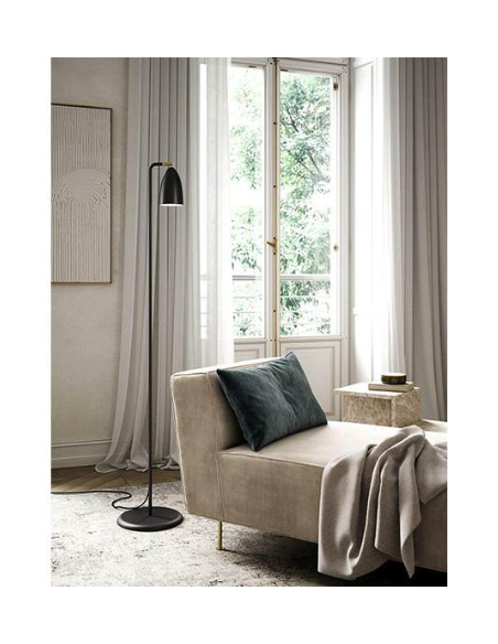 Com estrutura em metal preto mate, braço angular e cúpula em forma de sino, este modelo oferece uma iluminação direcionada e confortável, perfeita para áreas de leitura, salas de estar, quartos contemporâneos, ou projetos de hotelaria com estética nórdica.