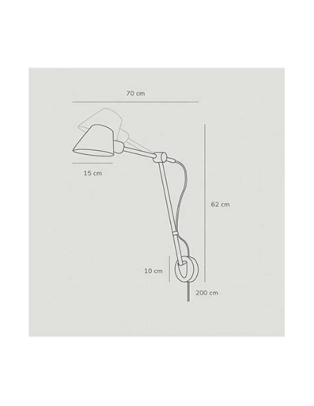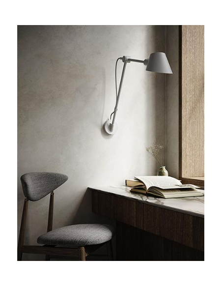 A sua estrutura articulada em metal preto mate permite ajustar a posição da luz, tornando-o perfeito como luz de leitura em cabeceiras de cama, iluminação funcional em escritórios, ou em projetos de hotelaria que valorizam o conforto visual e o design discreto.