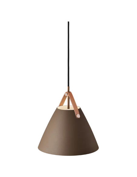 Suspensão em preto mate com 27 cm de diâmetro e detalhe em couro. Ideal para iluminação de mesas pequenas, ilhas e espaços de hotelaria.