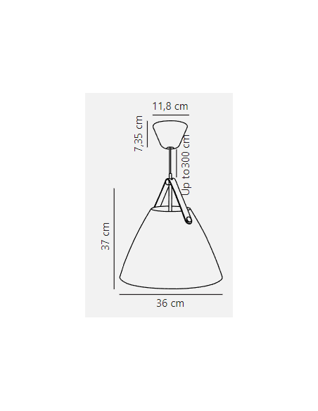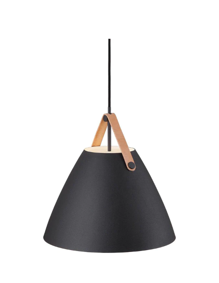 Fabricada em metal preto mate, esta suspensão inclui duas correias em couro natural (preto e castanho) para personalização do estilo, adicionando um detalhe visual que suaviza a sua forma geométrica.