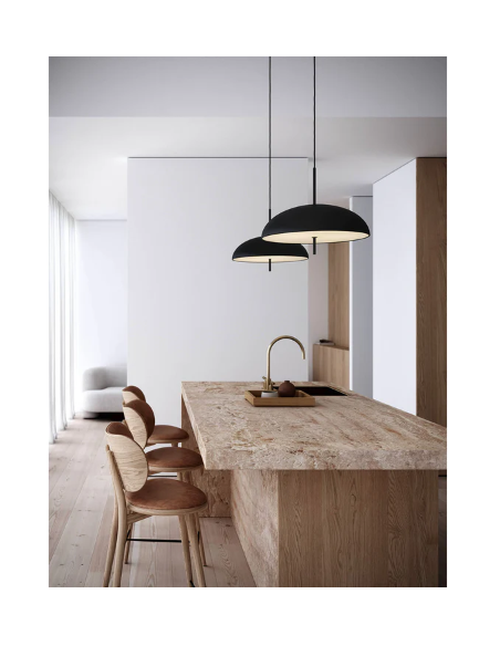 A suspensão VERSALE da Nordlux destaca-se pelo seu design clássico reinterpretado com linhas modernas e acabamento elegante. Fabricada em metal preto mate, apresenta um difusor em forma de cúpula larga que proporciona luz direcionada para baixo, ideal para zonas de refeição, bancadas, ilhas de cozinha ou mesas de trabalho.