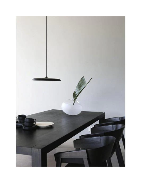 Com o seu formato circular plano e luz LED integrada, esta peça alia funcionalidade e design decorativo, sendo ideal para ambientes que exigem presença visual e conforto luminoso.