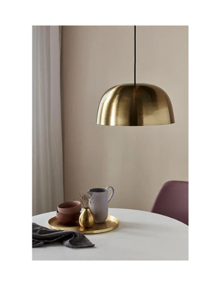A sua estrutura em metal dourado mate sustenta uma esfera de vidro branco acetinado, que emite uma luz difusa, perfeita para criar ambientes confortáveis e discretos.Este candeeiro adapta-se facilmente a interiores de estilo moderno ou contemporâneo, e é particularmente eficaz em zonas de refeição, mesas de apoio, quartos, ou em composições múltiplas sobre bancadas ou ilhas.