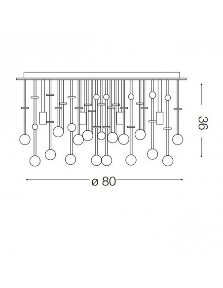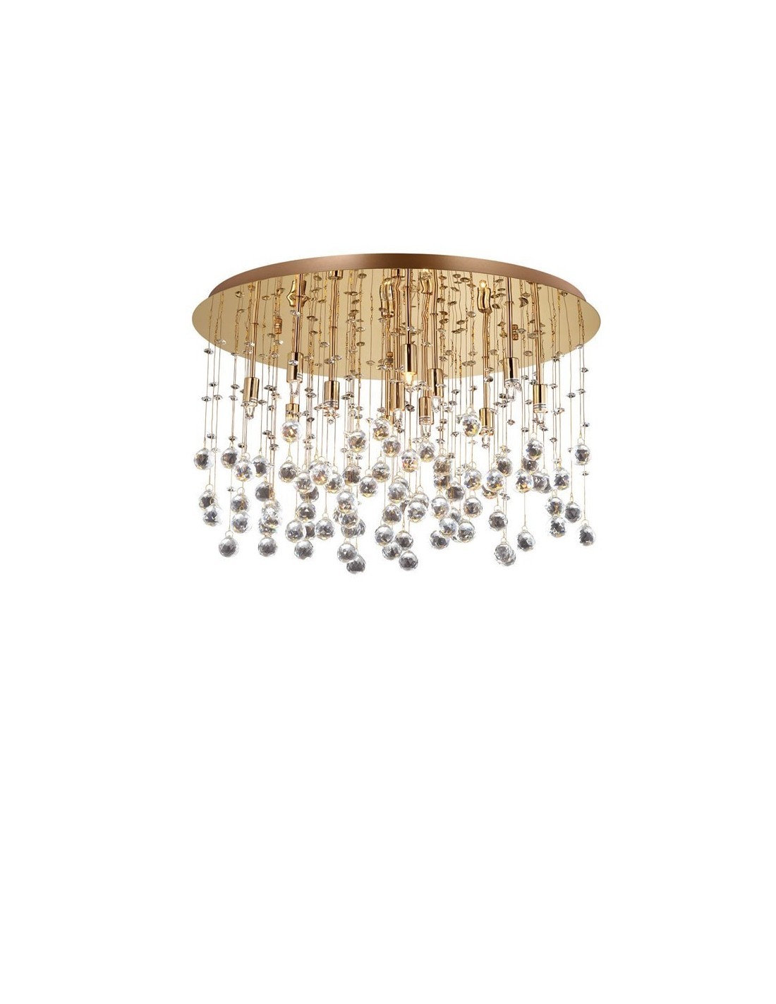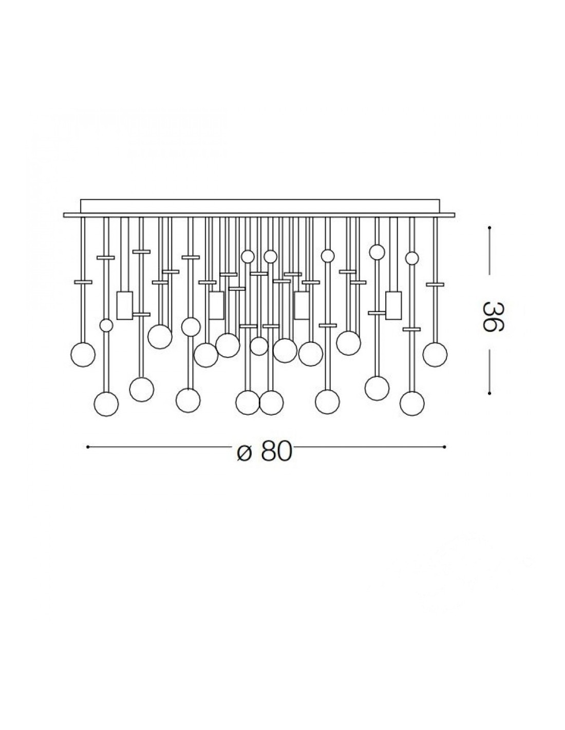 Estrutura metálica com acabamento disponível em cromo ou ouro. Pingentes com octógonos e esferas de cristal lapidadas.