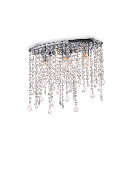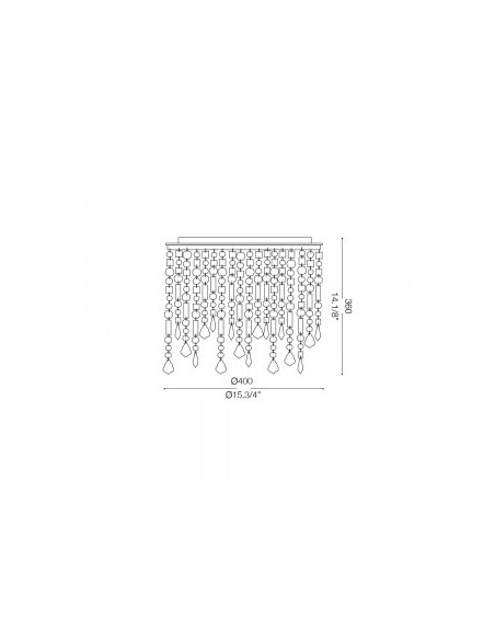 Estrutura metálica cromada. Pingentes com elementos de cristal lapidado em diversos formatos e gotas finais.